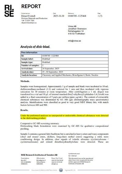Unsere Spülmaschinenblätter wurden vom Schwedischen Forschungsinstitut getestet, um sicherzustellen, dass sie keine unerwünschten Stoffe enthalten.